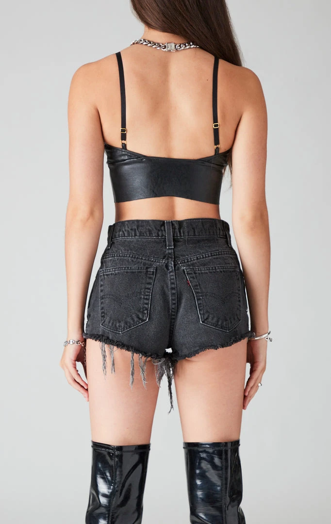 The Faux Leather Bralette by Commando. This crop top features four-way stretch that allows for optimal fit and comfort. With its leather look & cropped length, you can pair this top with almost anything.Â