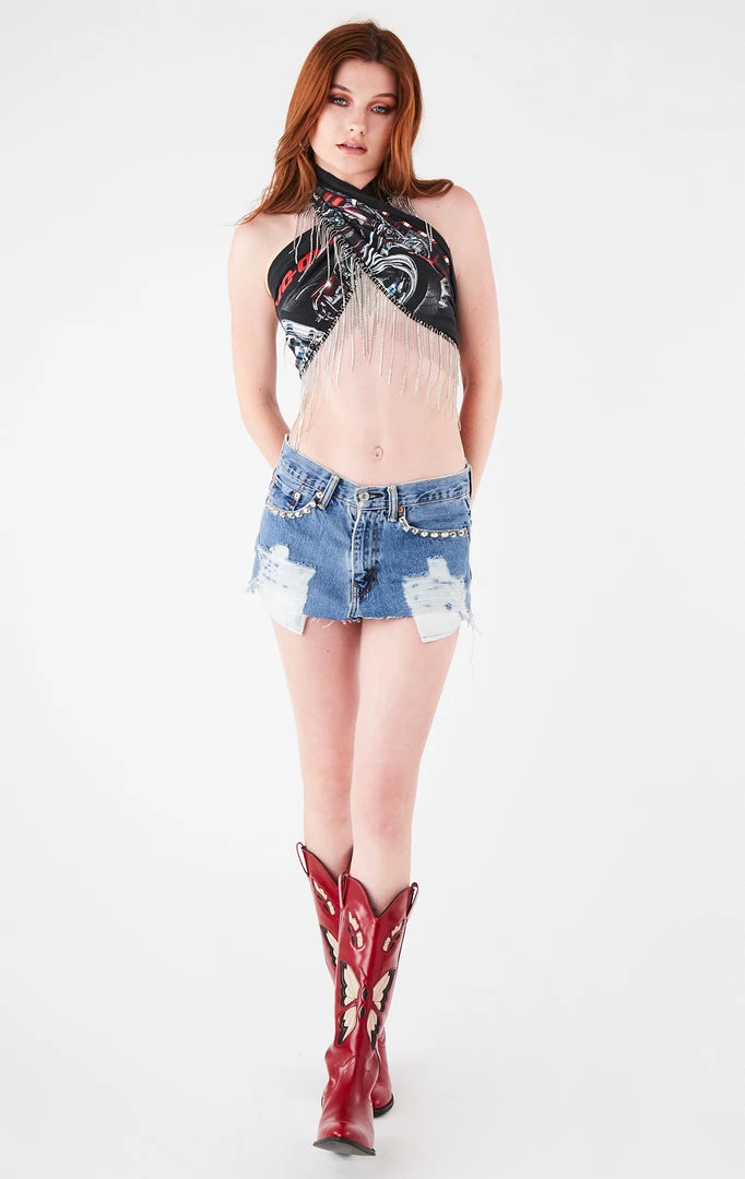 Furst of a Kind created the perfect halter wrap top. This top was reworked from a vintage motorcycle tee and features rhinestone fringe detailing. Cross this vintage wrap around your neck and finish it off with a tie in the back to create the perfect halter top.