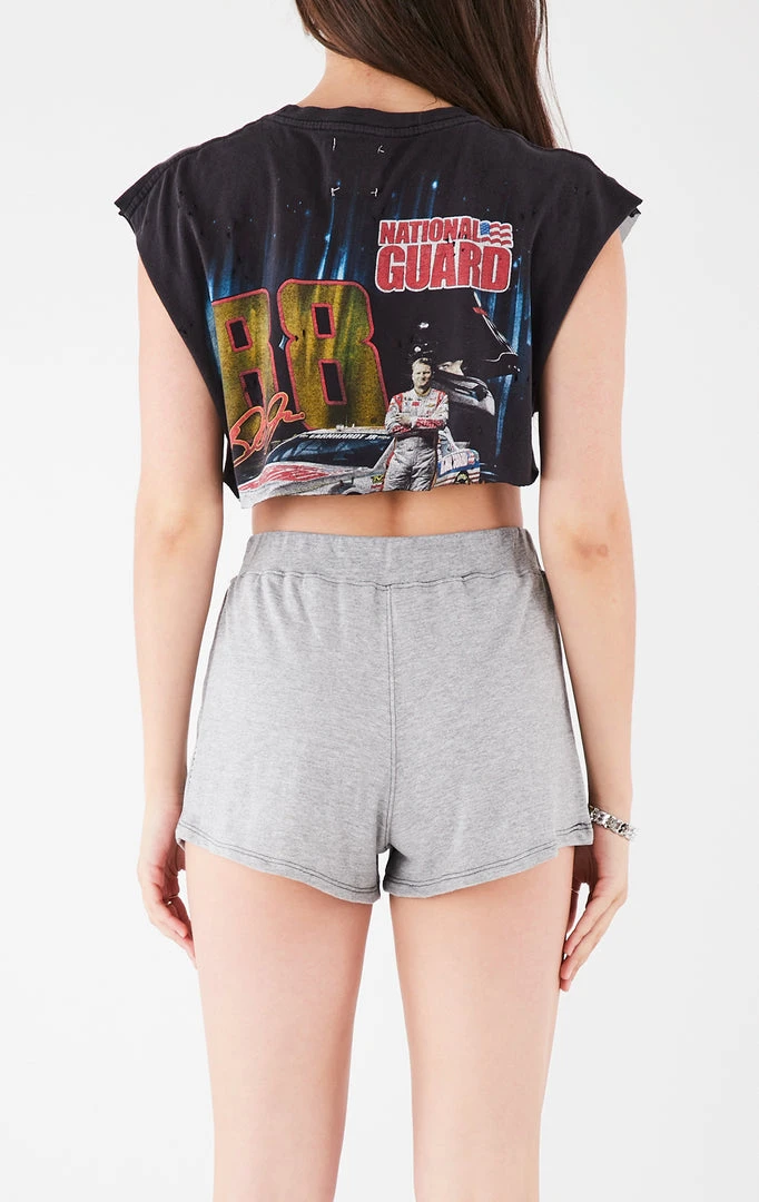 This one-of-a-kind mixed media sleeveless top and short set was crafted by Furst of a Kind from a vintage Nascar tee. Spliced together with another vintage t-shirt, sheer black mesh panels and finished with rhinestone trim.