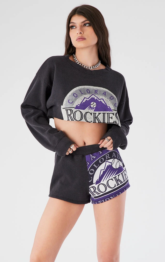 This one-of-a-kind set was reworked by Furst of a Kind from a vintage Colorado Rockies sweatshirt. Redesigned into a two piece set featuring a cropped sweatshirt paired with a spliced sweatshirt short.