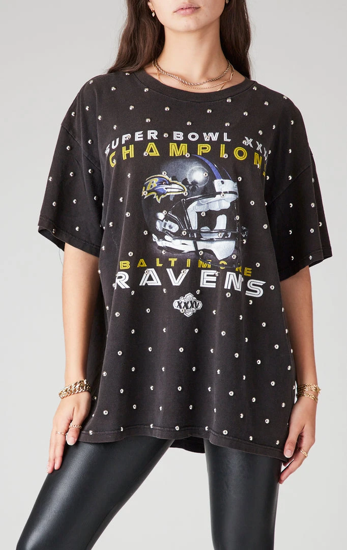 This vintageĀ Baltimore Ravens teeĀ has been reworked by hand by Furst of a Kind. This vintage NFL t-shirt is covered inĀ silver stud detailing on the bodice and sleeves.