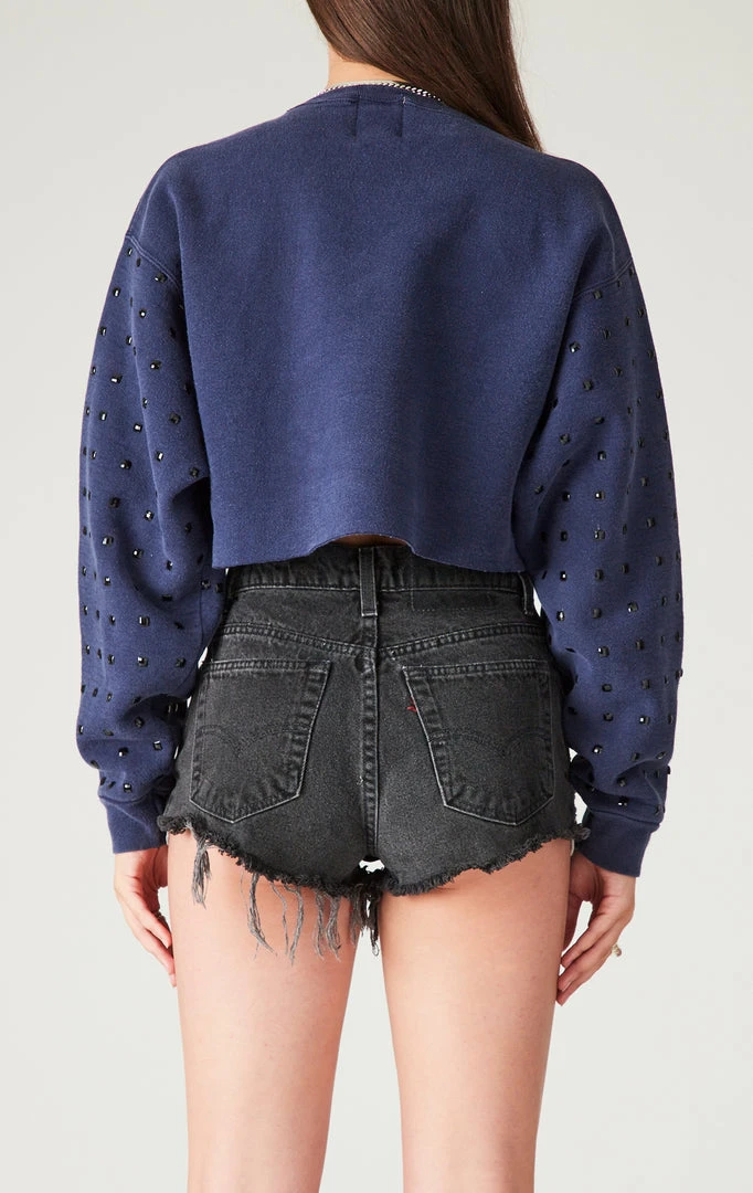 This one of a kind vintage University of Connecticut sweatshirt was reworked by Furst of a Kind. Featuring allover black rhinestone embellishment across the bodice and sleeves. The classic vintage crewneck shape and cropped cut make this piece a must-have, no matter the season.