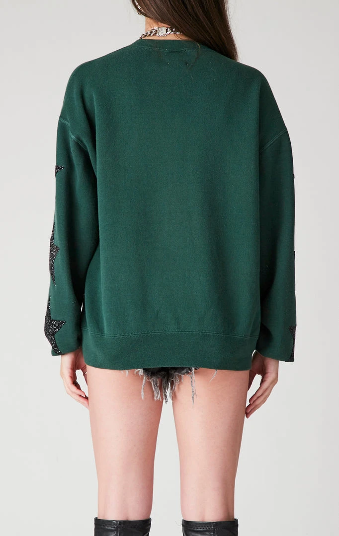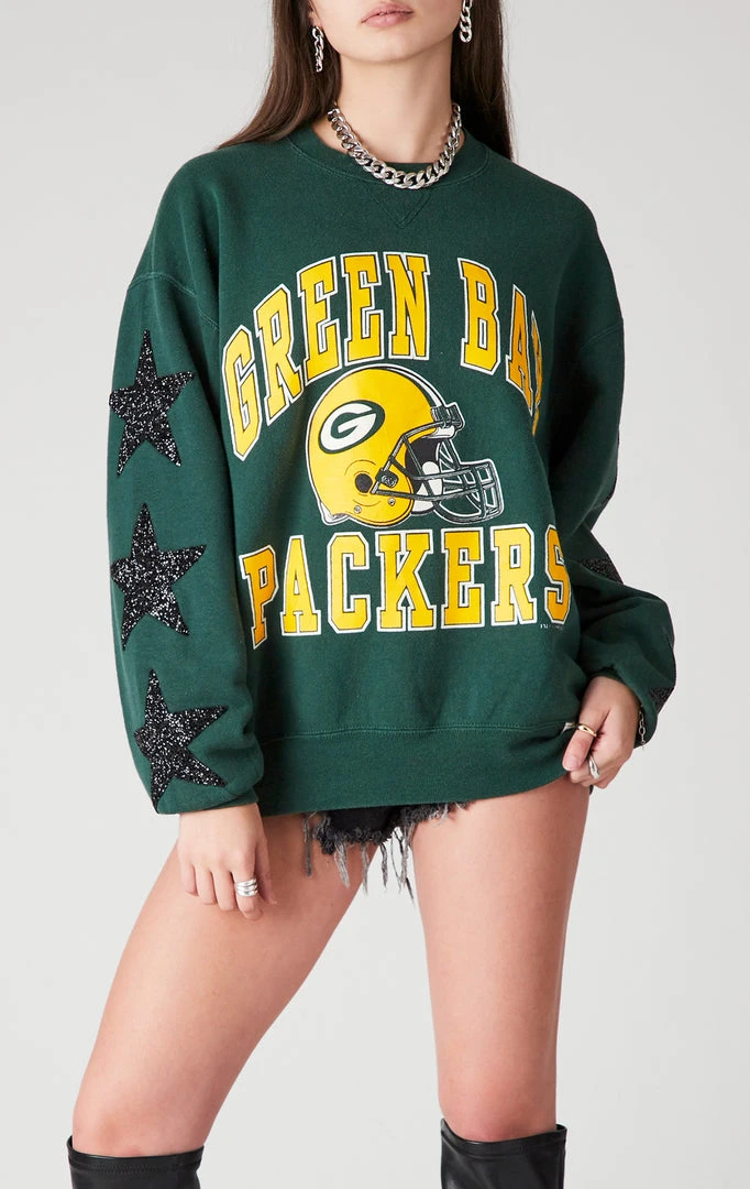 The Furst of a Kind all star. This vintage one of a kind Green Bay Packers sweatshirt was handpicked by Furst of a Kind as the perfect foundation to totally rework and bling out with black star patches on the sleeves. How could you not be starstruck? You know you want it.
