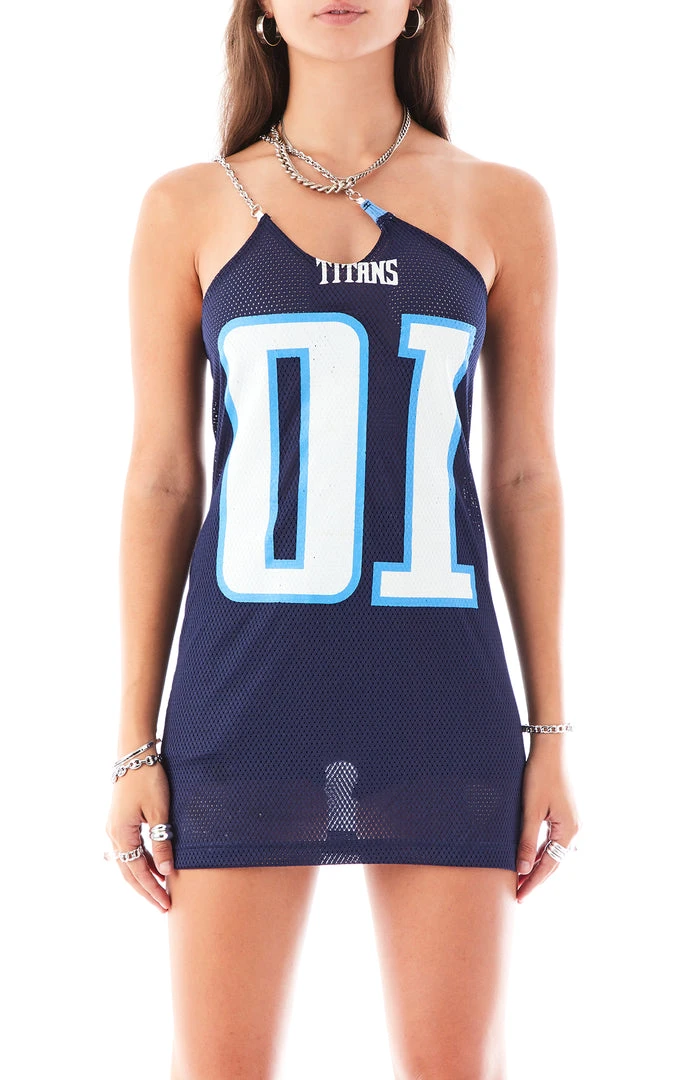 This one of a kind vintage Tennessee TitansĀ jersey was handpicked in the USA and reworked into a one shoulder dress that’s a total knockout. Furst of a Kind redesigned thisĀ piece from scratch-Ā making it extra shiny for you with silver double chain detailing across one shoulder. It’ll be good for you and your closet, so get the dress.Ā
