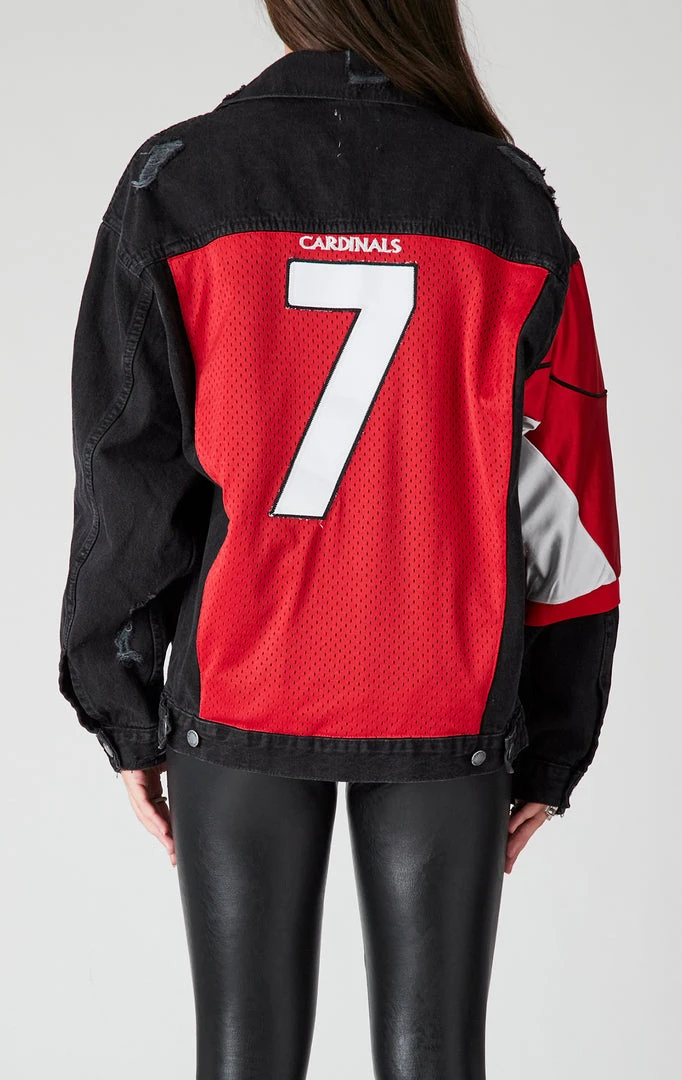 Hate to see you go, but love to watch you leave. It’s all about the back detail on this one of a kind repurposed denim jacket. Furst of a Kind added a vintage Arizona Cardinals jersey insert across the back and layered it over the sleeve. We are officially obsessed.Â