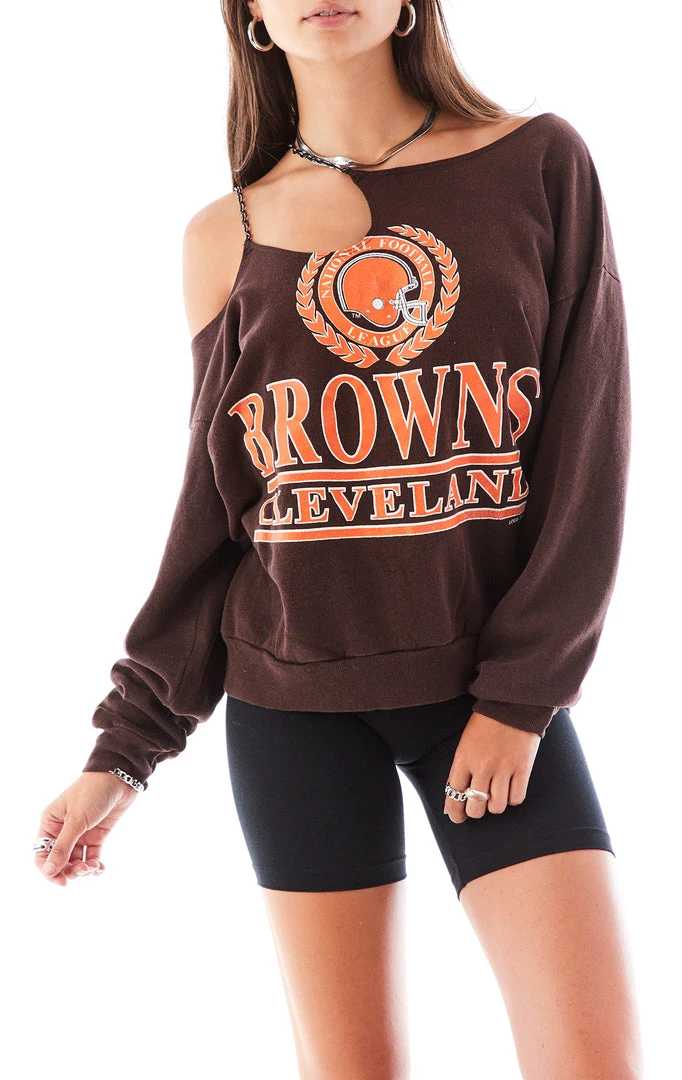 Cozy, but cute? Say less. This one of a kind vintage Cleveland Browns sweatshirt is raising the bar for reworked vintage. Featuring a peek-a-boo cut out shoulder moment with double chain detailing, Furst of a Kind has out done themselves yet again this season. You thought the tank version sold out fast? You better add to cart like, yesterday.