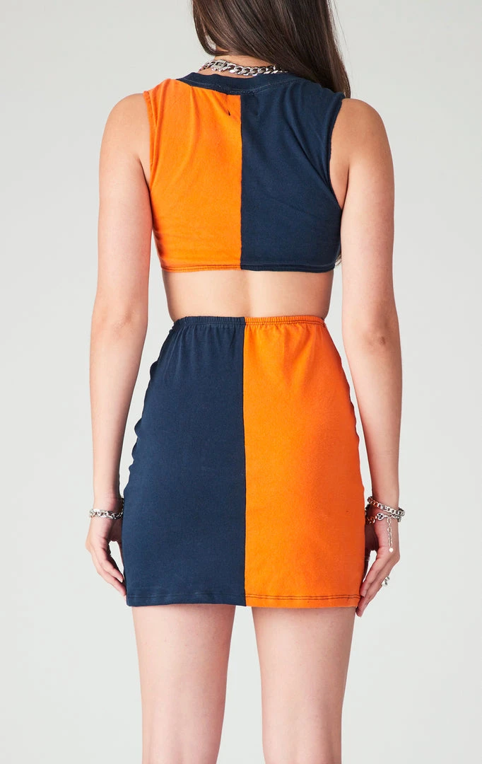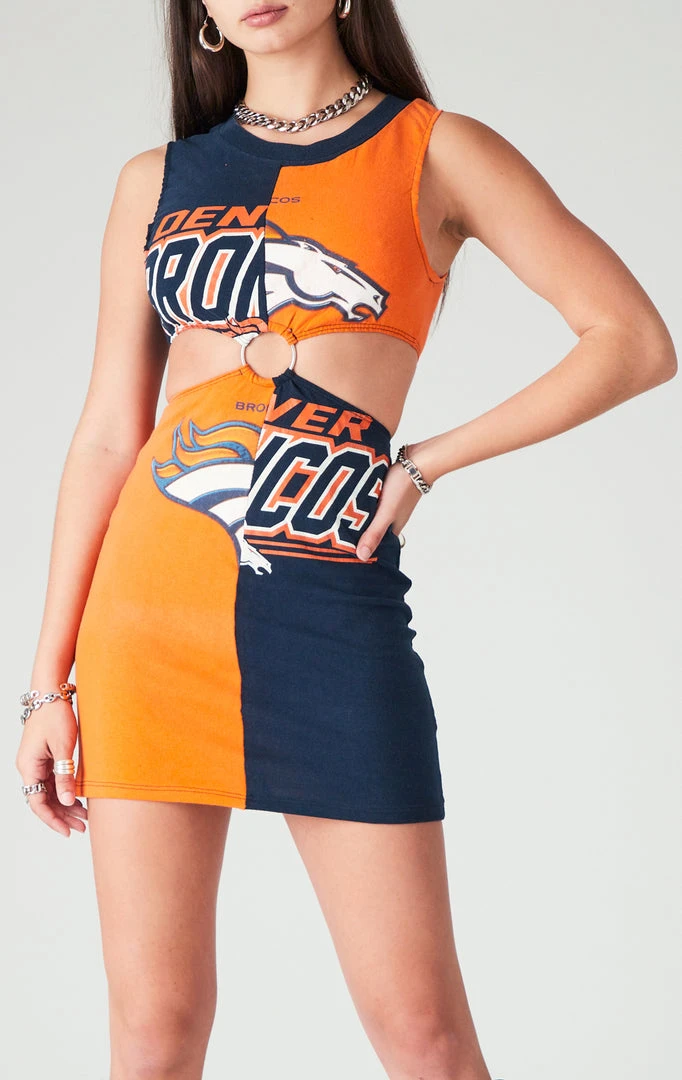 This dress is everything. Furst of a Kind put the WERK into reworked vintage once again with this killer vintageĀ Denver BroncosĀ spliced dress. Features a sleeveless cut, high neckline, peek-a-boo cut out center, and a metal O-ring detail that elevates this style to a whole new dimension.