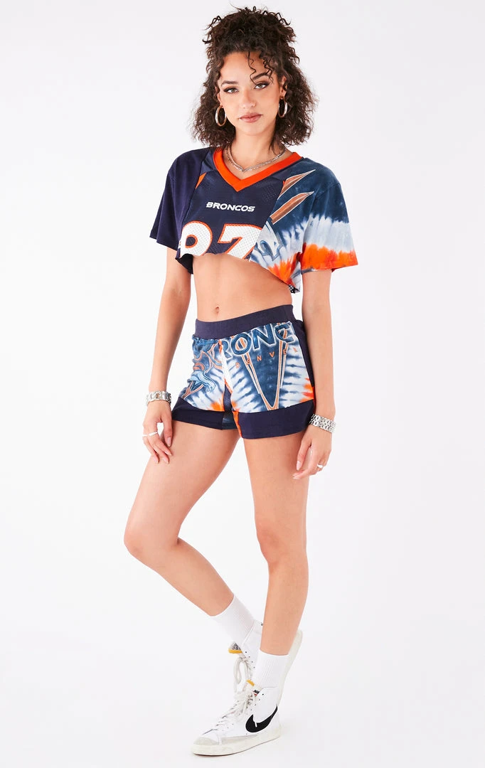 This one-of-a-kind set was reworked by Furst of a Kind from a vintage Denver Broncos jersey, tee and tie dye tee. These pieces were spliced together into a set featuring a crop top and shorts.Â