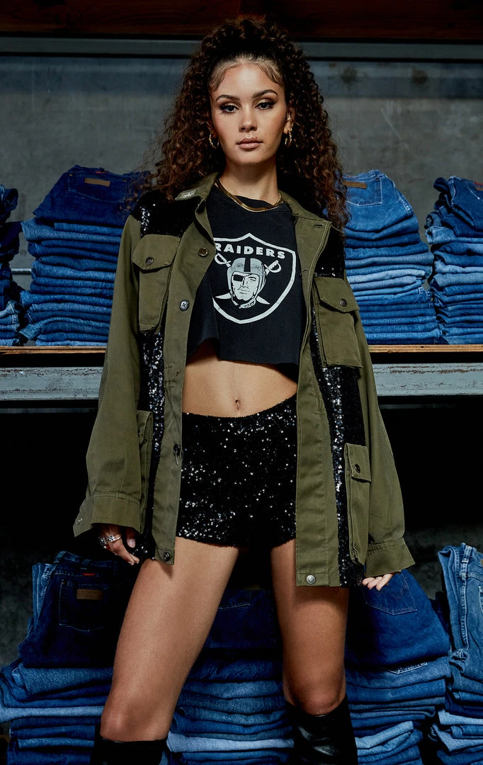 Opposites attract. Furst of a Kind reworked this vintage Army jacket with black sequin panel inserts. Featuring an oversized silhouette and front pockets.