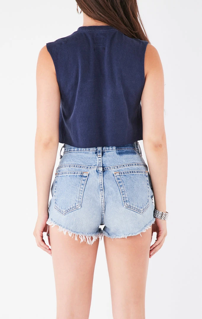 This vintage Atlanta Braves chain lace up tee is a truly iconic Furst of a Kind fit. Features a sleeveless cut, the perfect crop length and lace up detailing with silver chain. You can lace it tight or let it loose.