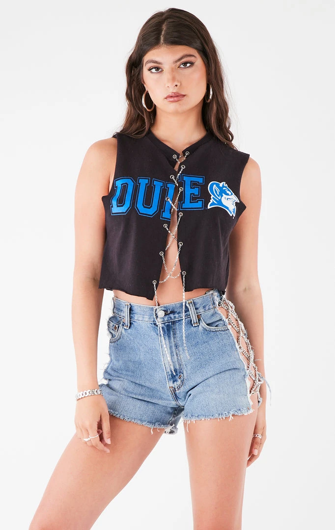 This vintageĀ Duke UniversityĀ chain lace up tee is a truly iconic Furst of a KindĀ fit.Ā Features a sleeveless cut, the perfect crop length and lace up detailing with silver chain. You can lace it tight or let it loose.