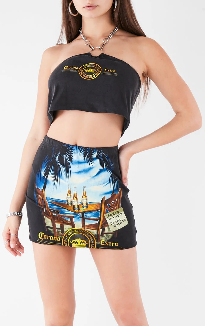 This one-of-a-kind set was designed by Furst of a Kind from a vintage Corona tee. Reworked into a cropped chain neck halter top and skirt.Â