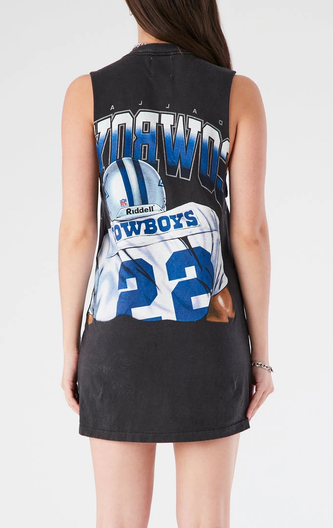 Furst of a Kind took an oversized vintageĀ Dallas Cowboys teeĀ and reworked it into a dress. This one-of-a-kind dress features chain trim down the front.Ā