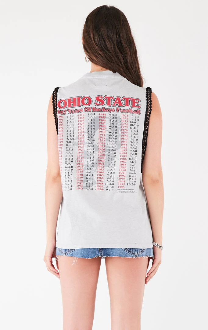 This vintage Ohio State University tee was sourced and reworked by Furst of a Kind in Los Angeles with a dramatic sleeveless cut and lined with chain trim.Â