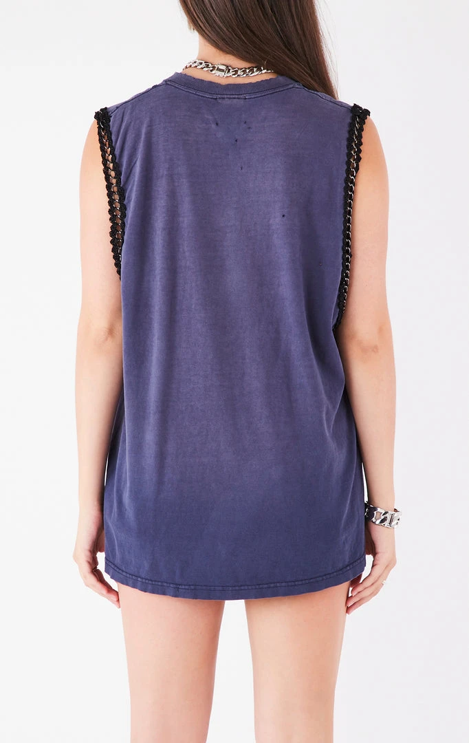 This vintage New England Patriots tee was sourced and reworked by Furst of a Kind in Los Angeles with a dramatic sleeveless cut and lined with chain trim.Â