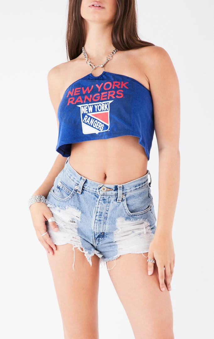 This one-of-a-kind vintage New York Rangers tee was reworked into a halter top by Furst of a Kind. Features a cropped halter cut & chunky silver chain detailing at the neckline.