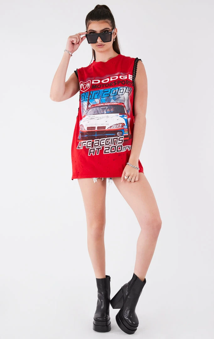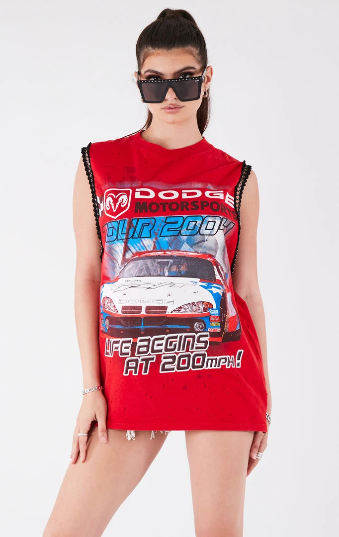 This vintage Nascar tee was sourced and reworked by Furst of a Kind in Los Angeles with a dramatic sleeveless cut and lined with chain trim.Â