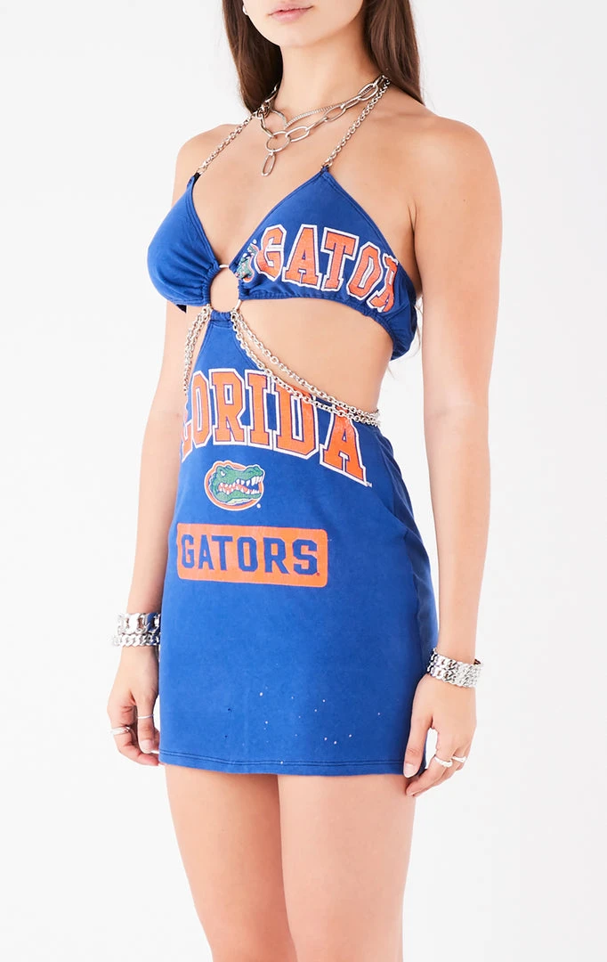 Furst of a Kind took an oversized vintage University of Florida tee and reworked it into a dress. This one-of-a-kind dress features double side cut outs, chain detailing and a chain halter neck line.