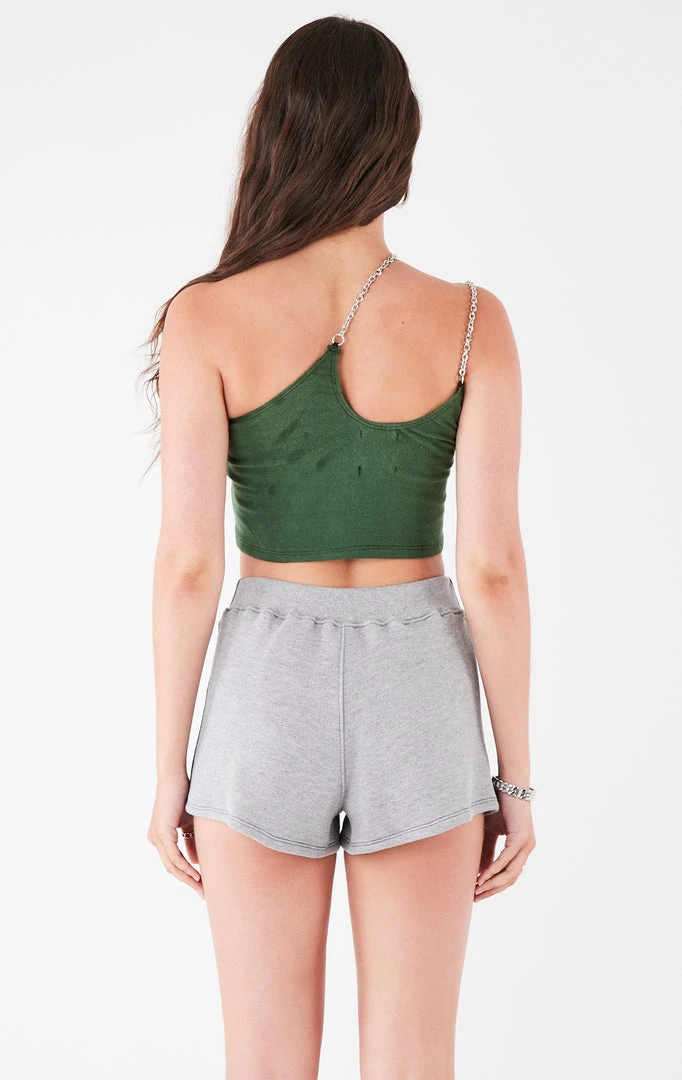 Furst of a Kind took a vintage University of Miami tee and reworked it into a two-piece set. This set is complete with a one-shoulder double chain tank top and spliced shorts.