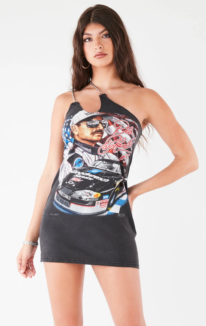 This one of a kind vintage Nascar tee was handpicked in the USA and reworked into a one shoulder dress. Furst of a Kind redesigned this piece by hand in Los Angeles with silver double chain detailing across one shoulder.