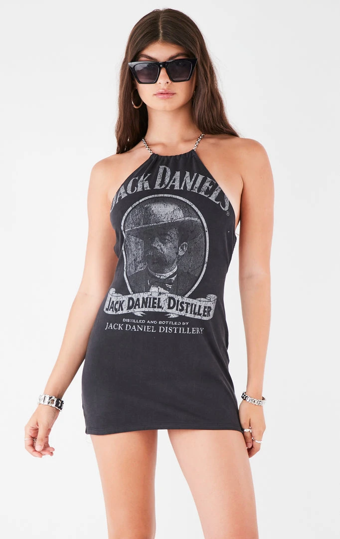 Furst of a Kind took a vintage Jack Daniel’s oversized tee and reworked it into a halter neck dress. This one-of-a-kind vintage dress features a waterfall chain back detail.Â