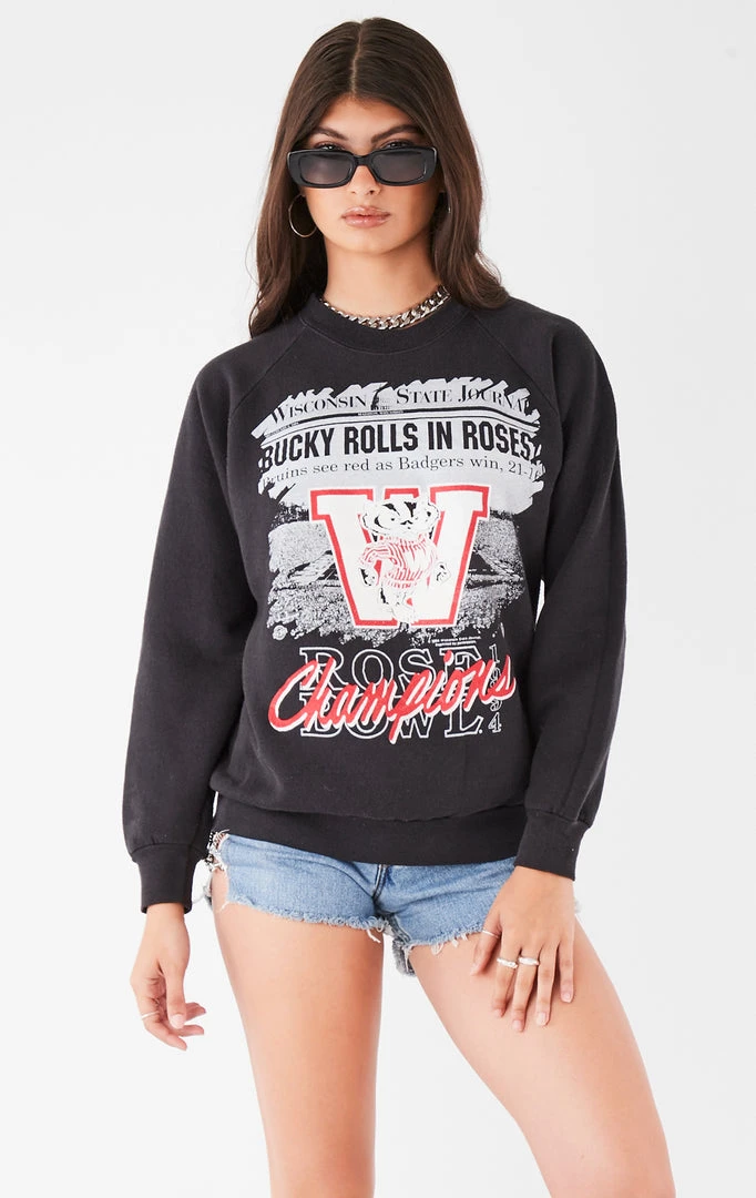 A classic vintage college sweatshirt. This University of Wisconsin sweatshirt was sourced in Los Angeles by Furst of a Kind. We’ve kept it just the way it was found to preserve its true vintage qualities.Â