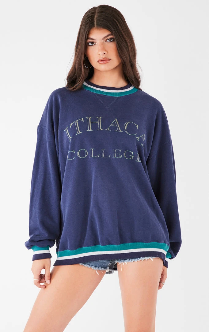 A classic vintage college sweatshirt. This Ithaca College sweatshirt was sourced in Los Angeles by Furst of a Kind. We’ve kept it just the way it was found to preserve its true vintage qualities.