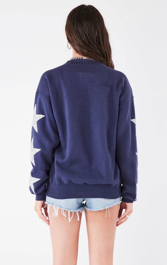 Upcycled from a vintage Penn State University sweatshirt. Furst of a Kind reworked this vintage college sweatshirt with silver star patch embellishment down both sleeves.Â