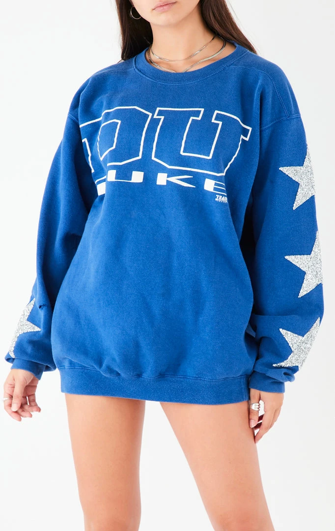 Upcycled from a vintage Duke University sweatshirt. Furst of a Kind reworked this college sweatshirt with silver star patch embellishment down both sleeves.