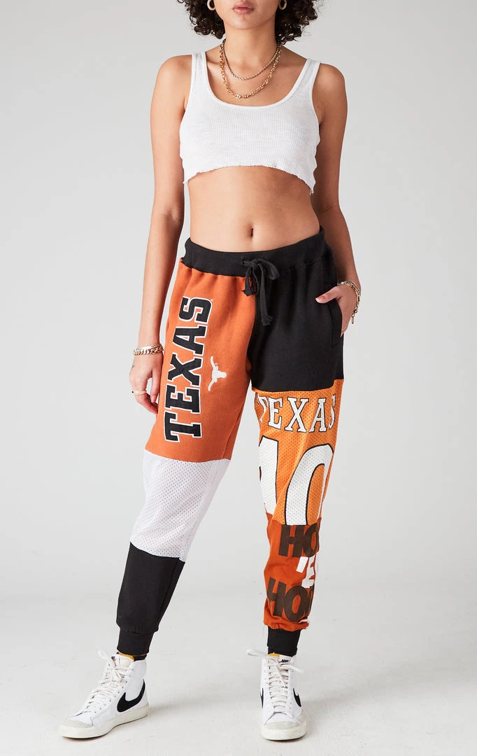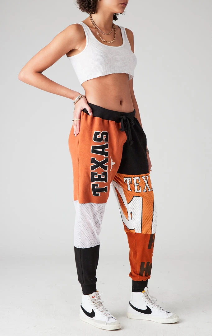 You need these reworked sweatpants from Furst of a Kind. Hand sourced, sewn & spliced, these vintage University of Texas patchwork sweatpants are the epitome of cool. Featuring assorted vintage graphic inserts in a relaxed fit silhouette with pockets and drawstring closure. Style on the street or in the stands, the choice is yours.Â