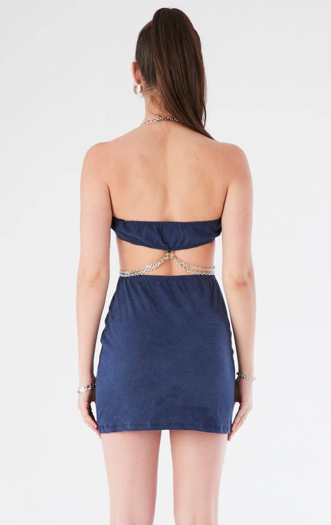 Furst of a Kind took an oversized vintage Atlanta Braves tee and reworked it into a dress. This one-of-a-kind dress features double side cut outs, chain detailing and a chain halter neck line.Â