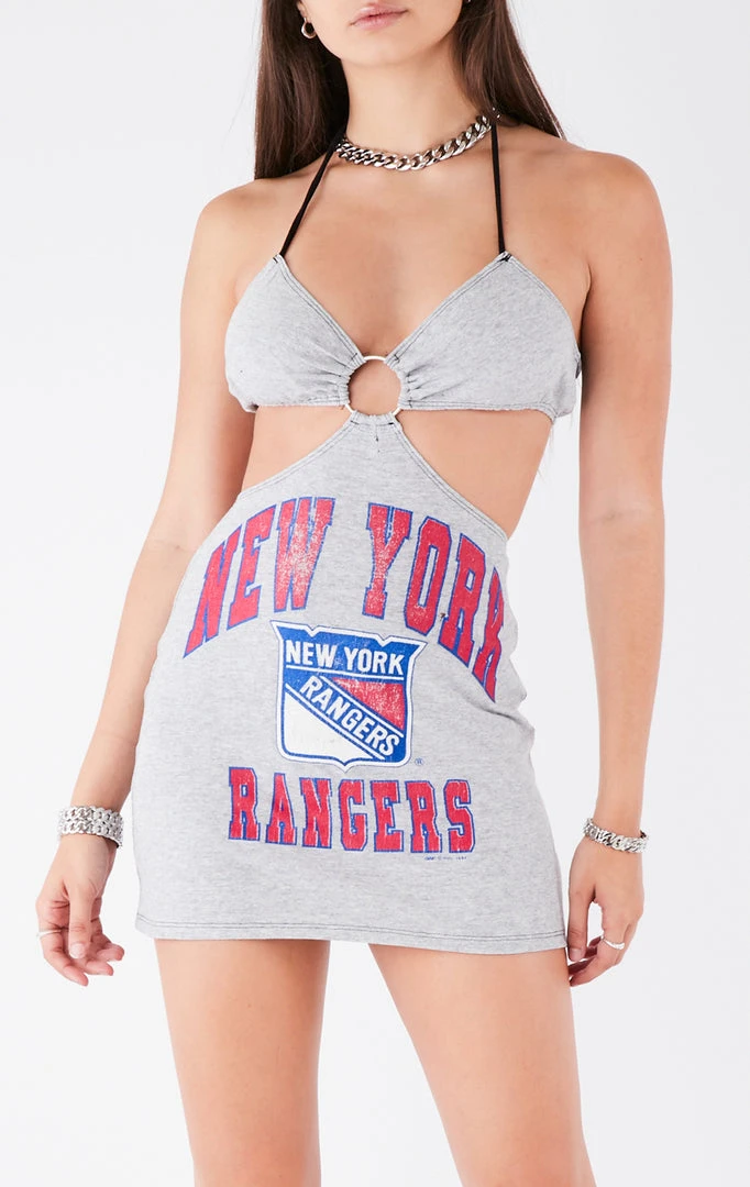 Furst of a Kind took an oversized vintage New York Rangers tee and reworked it into a dress. This one-of-a-kind dress features double side cut outs, o-ring and halter neck line.Â