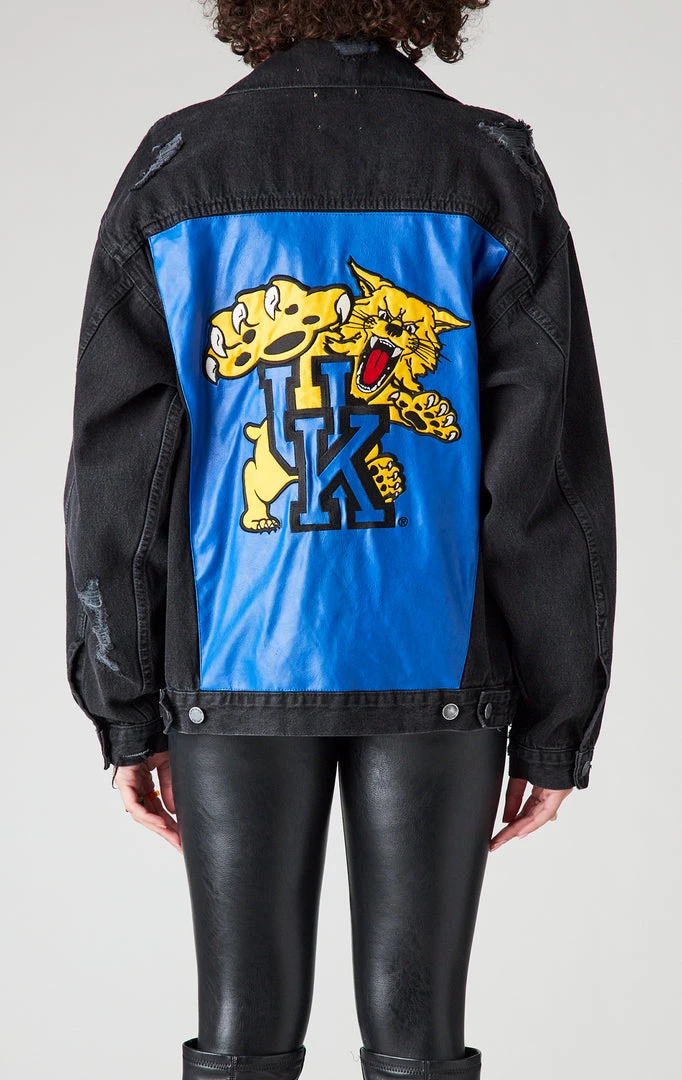 It’s all about the back detail on this one-of-a-kind repurposed black denim jacket. Furst of a Kind reworked this denim jacket with a vintage University of Kentucky graphic insert on the back.