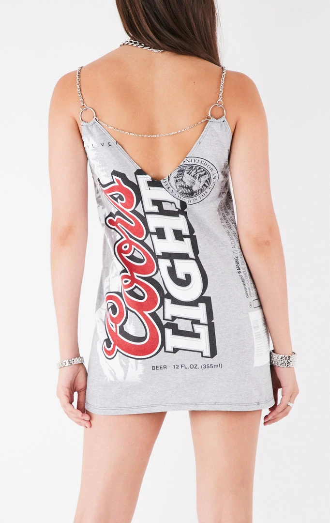 This one-of-a-kind vintage Coors Light tee was handpicked in the USA and reworked into a tank dress. Furst of a Kind redesigned this piece by hand in Los Angeles with chain straps and draped chain detailing.