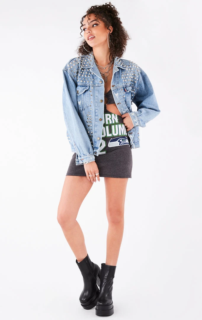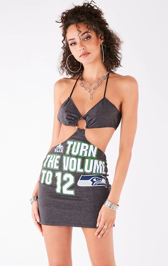 Furst of a Kind took an oversized vintage Seattle Seahawks tee and reworked it into a dress. This one-of-a-kind dress features double side cut outs, o-ring and halter neck line.Â