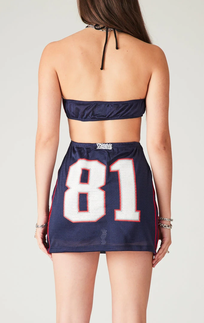 This One of a Kind dress started out as a vintage New England Patriots Jersey, until Furst of a Kind got ahold of it. This piece was reworked into the ultimate jaw dropping dress with fresh double side cut outs and a halter neckline. There’s no comparing this dress, your other vintage could NEVER.