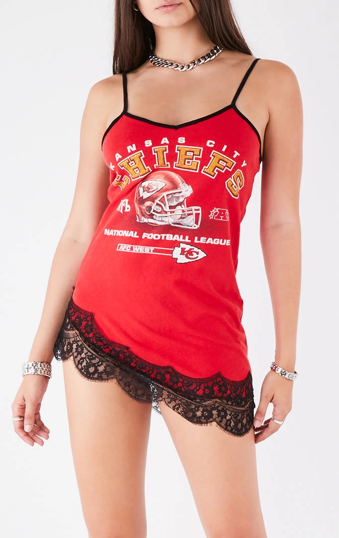 Furst of a Kind took an oversized vintageĀ Kansas City ChiefsĀ tee and reworked it into a dress. This one-of-a-kind tank dress features lace trim at the hem.