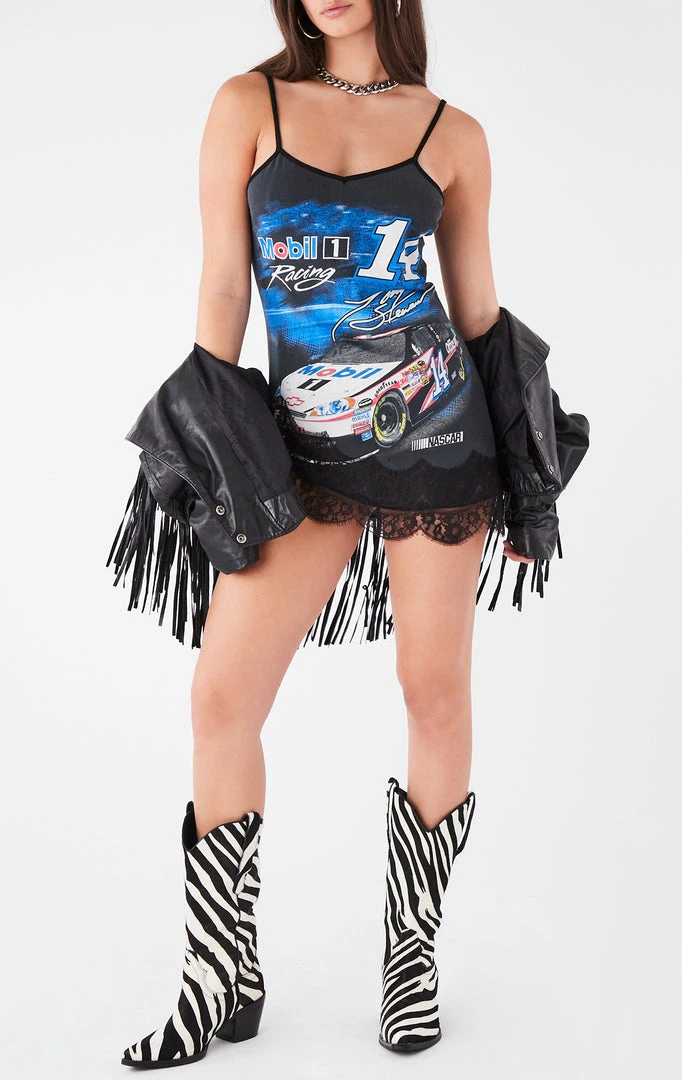 Furst of a Kind took an oversized vintageĀ NascarĀ tee and reworked it into a dress. This one-of-a-kind tank dress features lace trim at the hem.