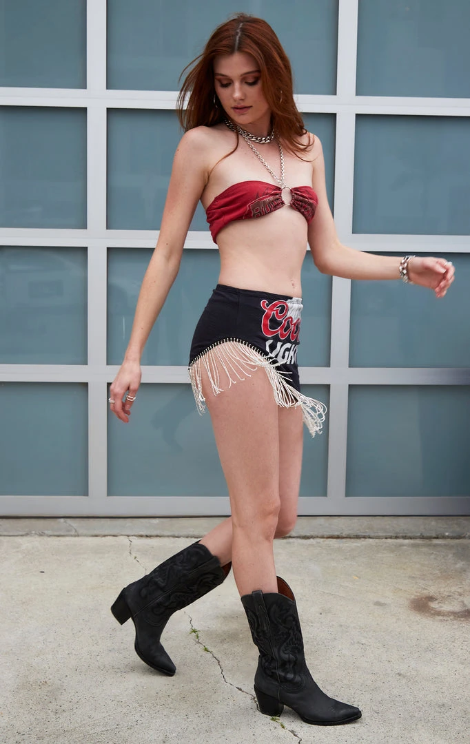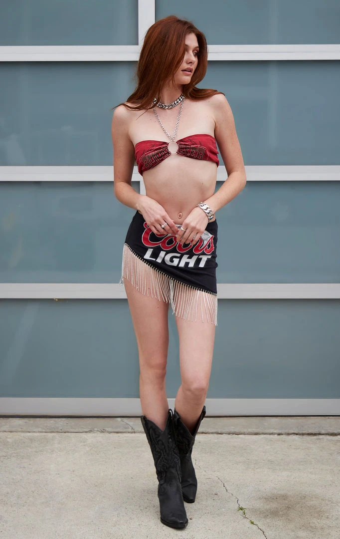 This vintage Coors Light tee was upcycled by Furst of a Kind and reworked into a one-of-a-kind skirt. Features a curved hem and rhinestone fringe.