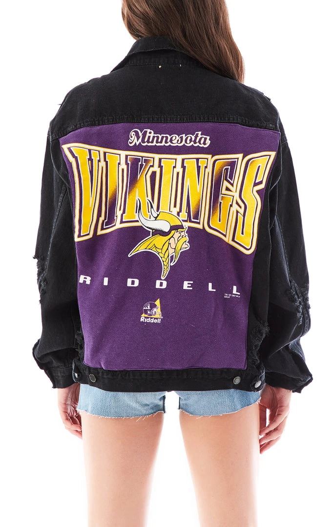 It’s all about the back detail on this one of a kind repurposed black denim jacket. Furst of a Kind added a vintage Minnesota Vikings sweatshirt insert and we are officially obsessed.Â