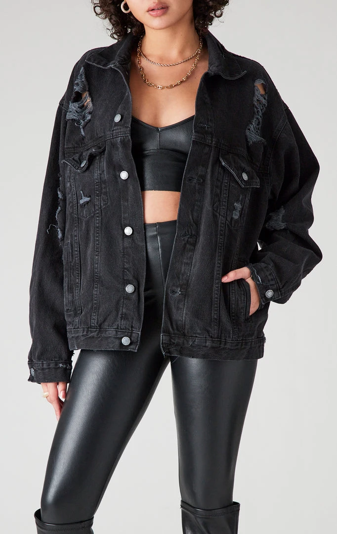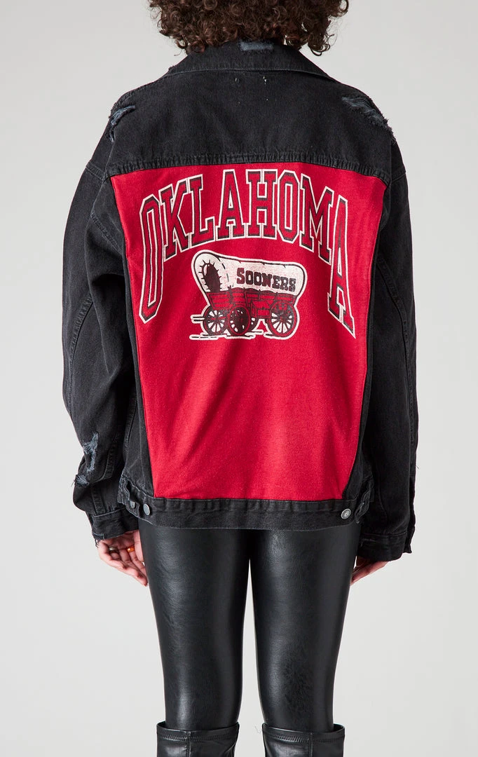 It’s all about the back detail on this one-of-a-kind repurposed black denim jacket. Furst of a Kind reworked this denim jacket with a vintage University of Oklahoma graphic insert on the back.
