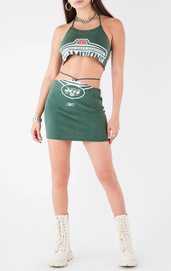 This one-of-a-kind set was designed by Furst of a Kind from a vintage New York Jets tee. Reworked into a cropped halter top and skirt with adjustable ties at the waist.