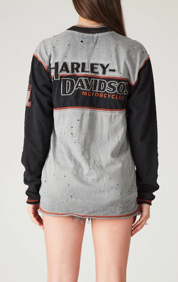 Let’s ride. This vintage long sleeve Harley Davidson tee is the one for you. Furst of a Kind sourced this one of a kind piece and stonewashed it for a worn in feel and naturally distressed look. There’s no wrong way to wear this Harley vintage tee.Â