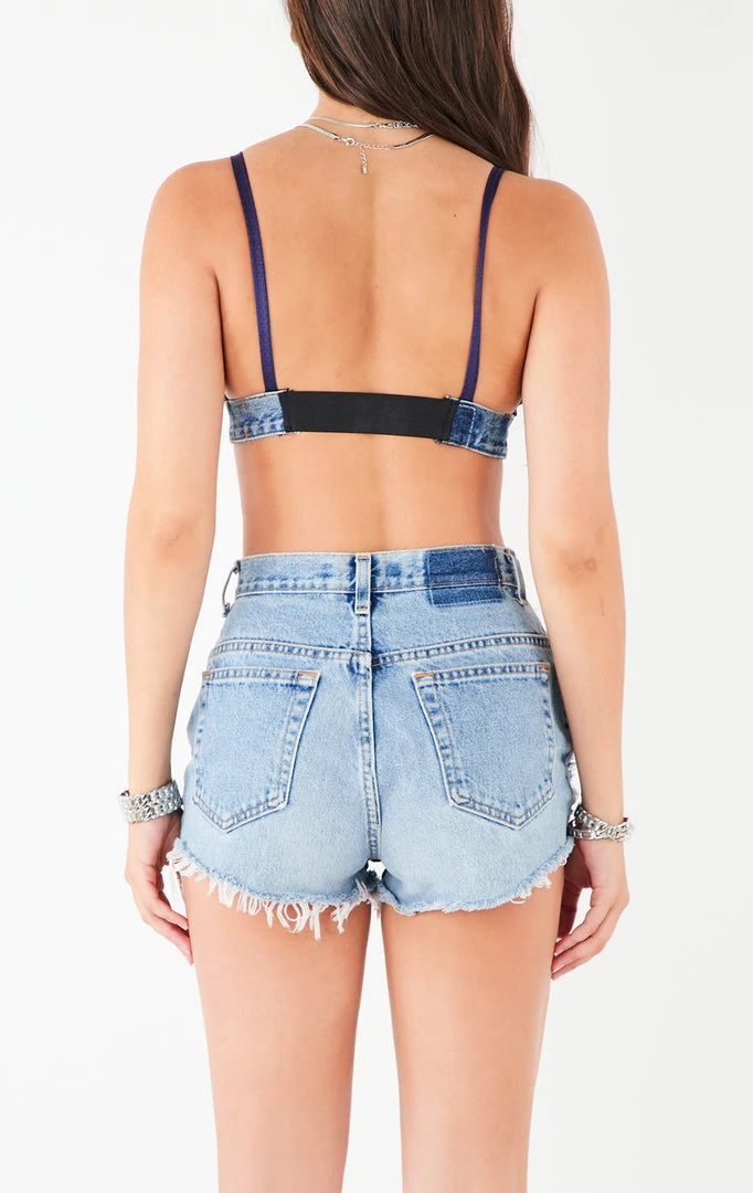 Furst of a Kind reworked a vintage Levi’s denim waistband and New England Patriots jersey into this statement bra top. Features a button front closure and elastic at the back.