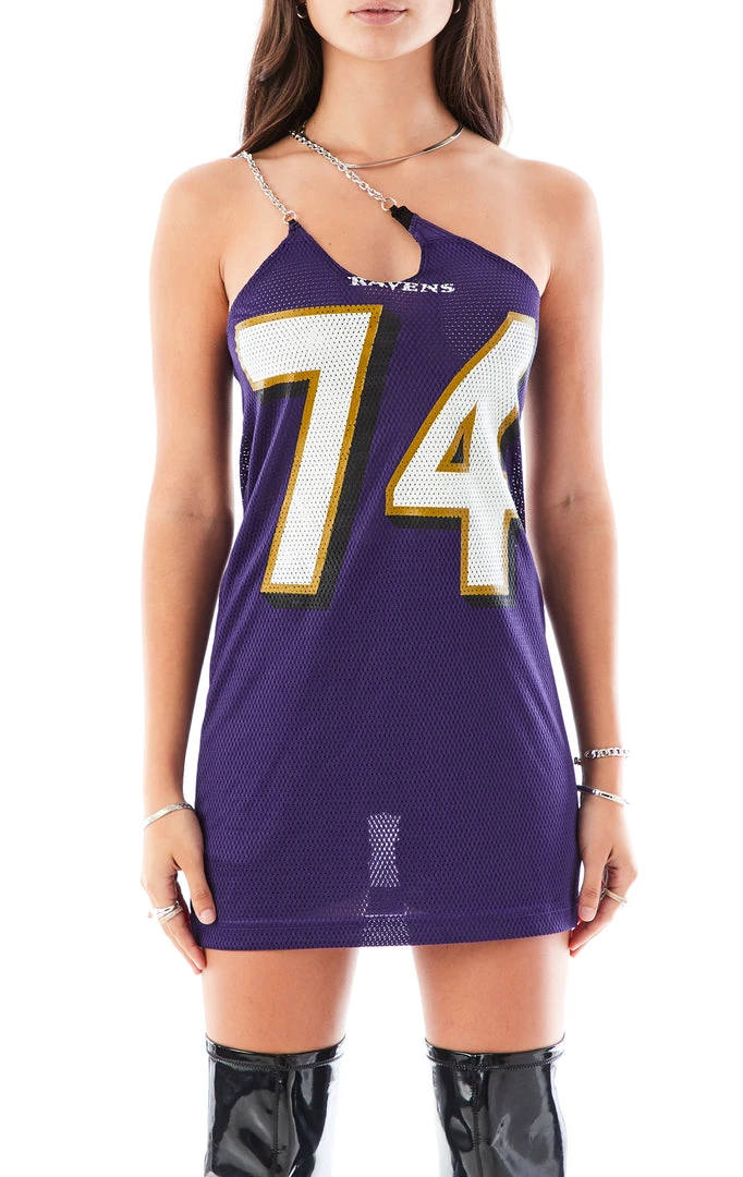 This one of a kind vintageĀ Baltimore Ravens jersey was handpicked in the USA and reworked into a one shoulder dress that’s a total knockout. Furst of a Kind redesigned thisĀ piece from scratch-Ā making it extra shiny for you with silver double chain detailing across one shoulder. It’ll be good for you and your closet, so get the dress.Ā