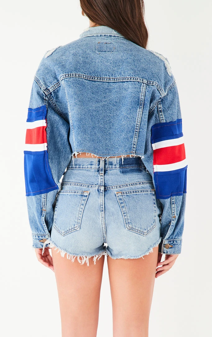 This reworked denim jacket was upcycled by Furst of a Kind. Crafted from the perfect oversized vintage Levi’s denim jacket body and patches from a vintage New York Rangers tee and jersey. Finished off with studding and a cropped hem. Hand sourced and sewn in Los Angeles.