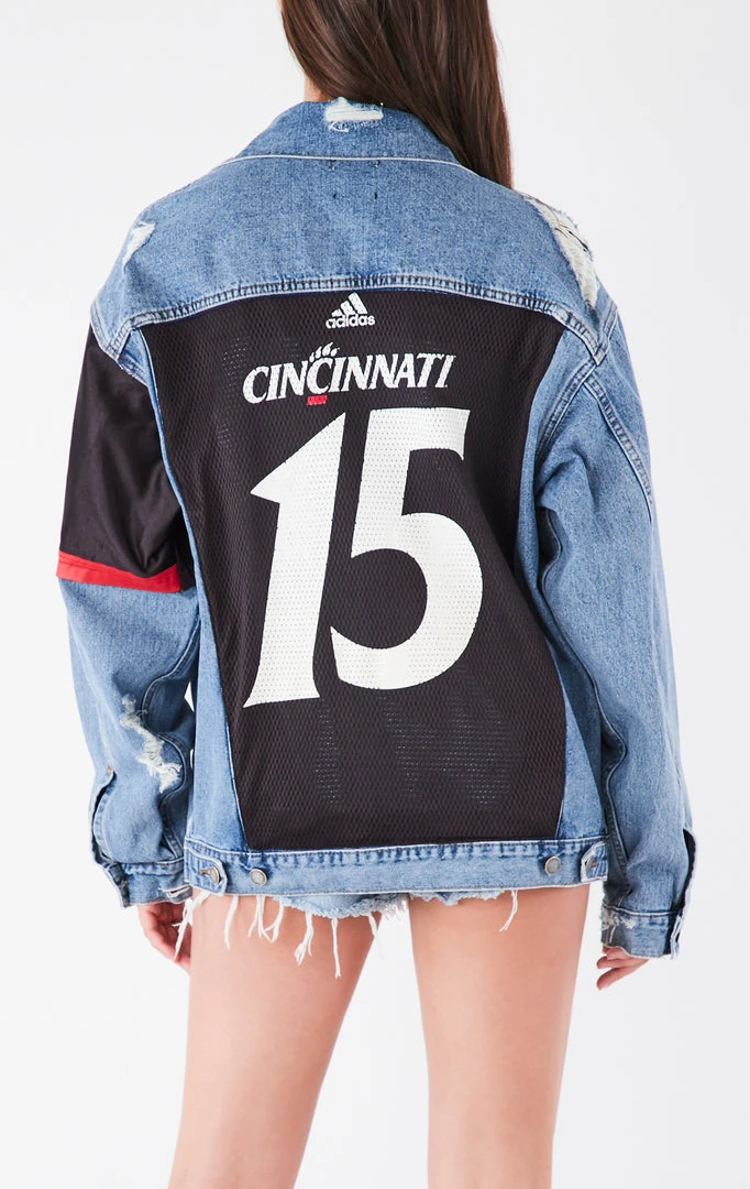 It’s all about the back detail on this one of a kind repurposed denim jacket. Furst of a Kind added a vintage University of Cincinnati jersey insert across the back and layered it over the sleeve. We are officially obsessed.Â
