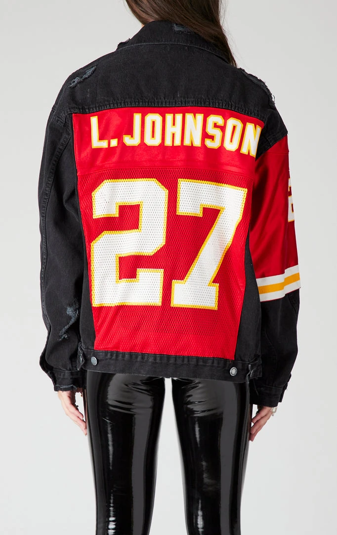 Hate to see you go, but love to watch you leave. It’s all about the back detail on this one of a kind repurposed denim jacket. Furst of a Kind added a vintage Kansas City Chiefs jersey insert across the back and layered it over the sleeve. We are officially obsessed.