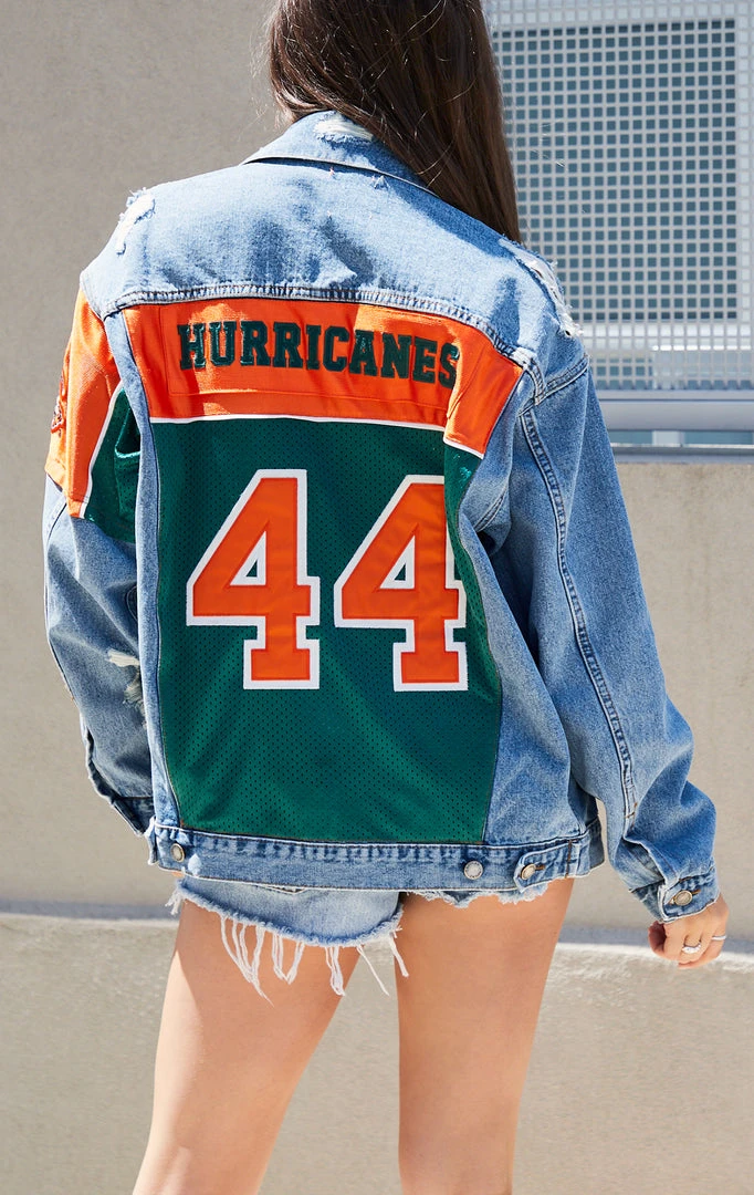 It’s all about the back detail on this one of a kind repurposed denim jacket. Furst of a Kind added a vintage University of Miami jersey insert across the back and layered it over the sleeve.