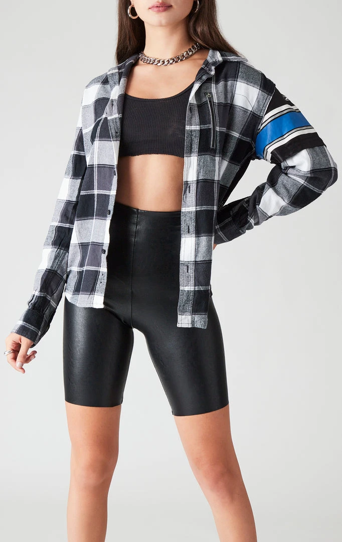 Hate to see you go, but love to watch you leave. It’s all about the back detail on this one of a kind vintage flannel. Furst of a Kind added a vintage Detroit Lions jersey insert across the back and layered it over the sleeve of this plaid top. We are officially obsessed.Â
